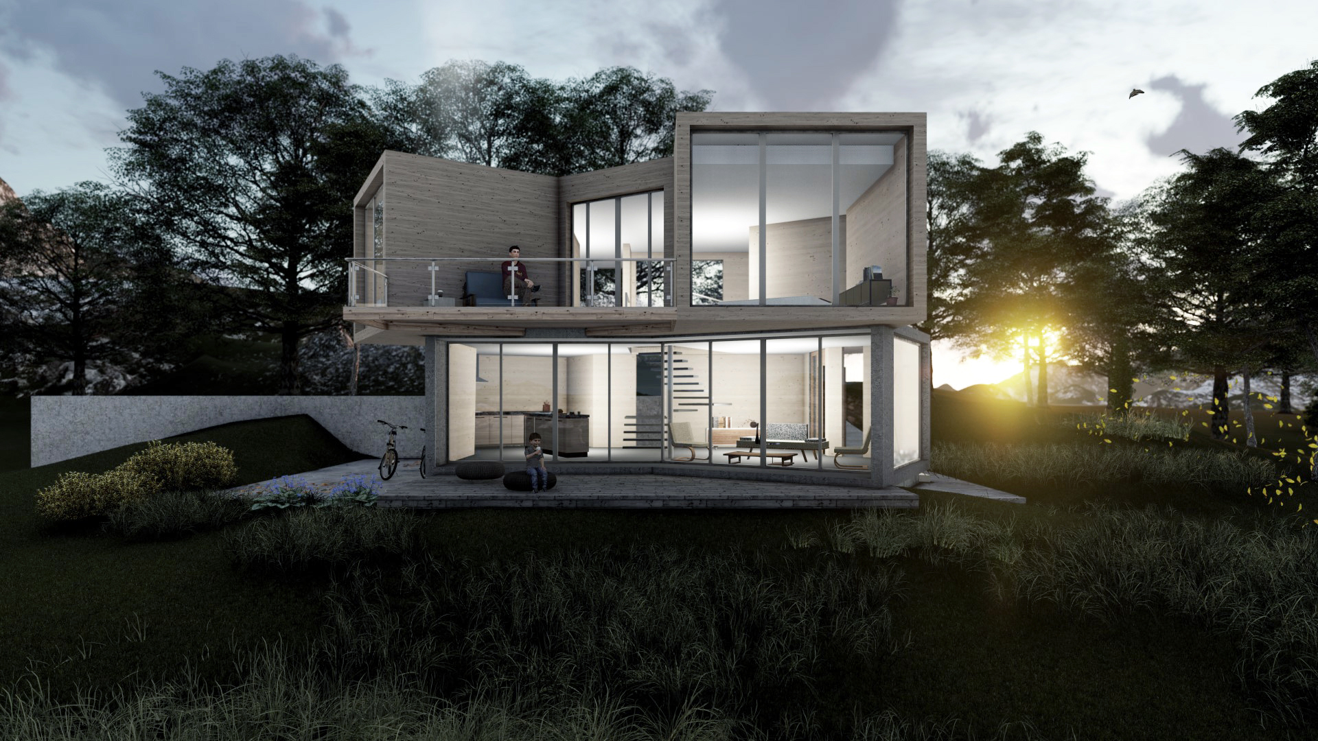 La maison se compose de deux volumes distincts. Au rez-de-chaussée, un bloc massif, tel un socle ancré au sol, accueille les espaces communs. À l'étage, les chambres s'élancent vers le paysage, semblables à des balcons suspendus, invitant à la communion avec la nature environnante. Favorisant les interactions familiales, les deux niveaux se connectent autour d'un espace central vertical, tandis que l'intimité des chambres est préservée par la disposition des volumes, sans cloisons ni portes. Une conception ouverte et fluide qui célèbre l'harmonie entre l'architecture et la nature.